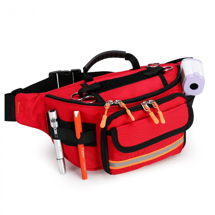 Geanta este neechipată, permițându-vă să o personalizați cu materialele de prim ajutor specifice nevoilor dumneavoastră sau ale grupului cu care călătoriți. Dispune de un compartiment frontal cu fermoar, care poate fi folosit pentru a stoca articole mici și de acces rapid, cum ar fi dezinfectanți sau bandaje. În plus, suporturile integrate pentru pixuri și termometru fac organizarea și accesarea rapidă a acestor instrumente esențiale.