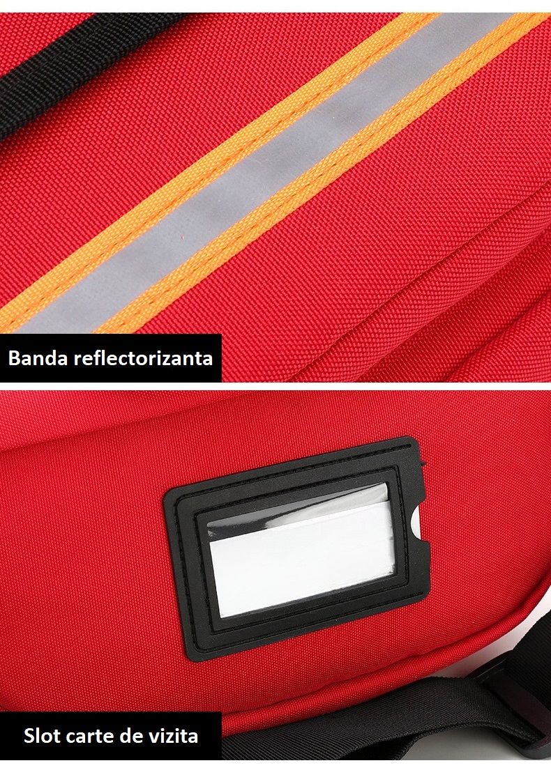 Un detaliu important pentru siguranță este banda reflectorizantă amplasată pe suprafața frontală, care crește vizibilitatea trusei în condiții de iluminare scăzută. De asemenea, slotul pentru carte de vizită sau etichetă permite identificarea rapidă a proprietarului trusei sau oferă informații suplimentare care pot fi vitale în situații de urgență.
