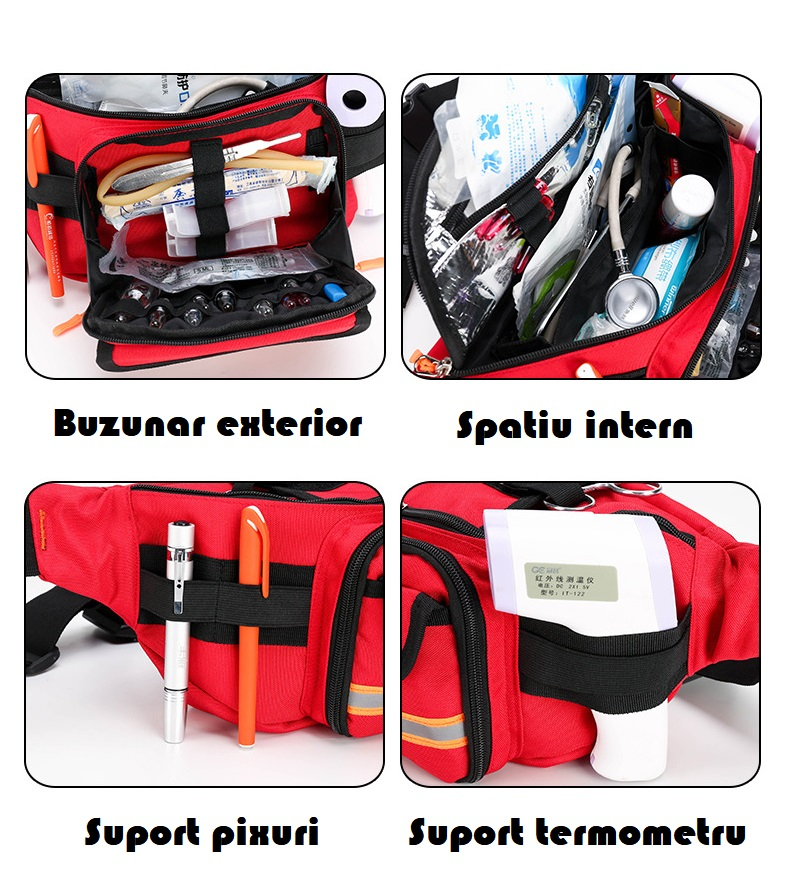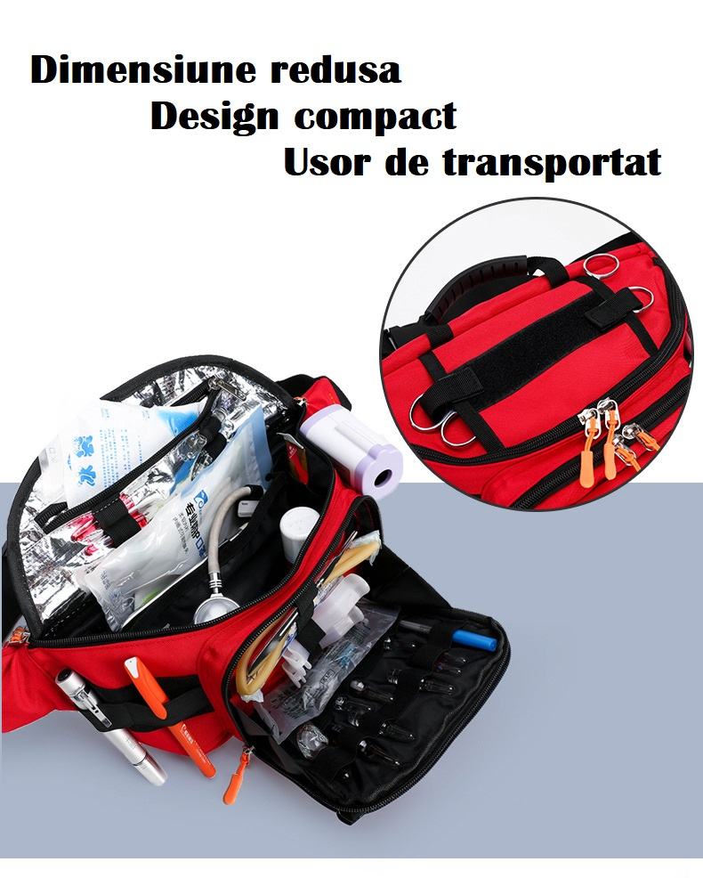 Compartimentul central dublu oferă un spațiu generos pentru a așeza echipamente mai mari, precum apa oxigenata, rivanol, stetoscop sau comprese, în timp ce buzunarul termic cu fermoar este ideal pentru păstrarea medicamentelor la o temperatură constantă.