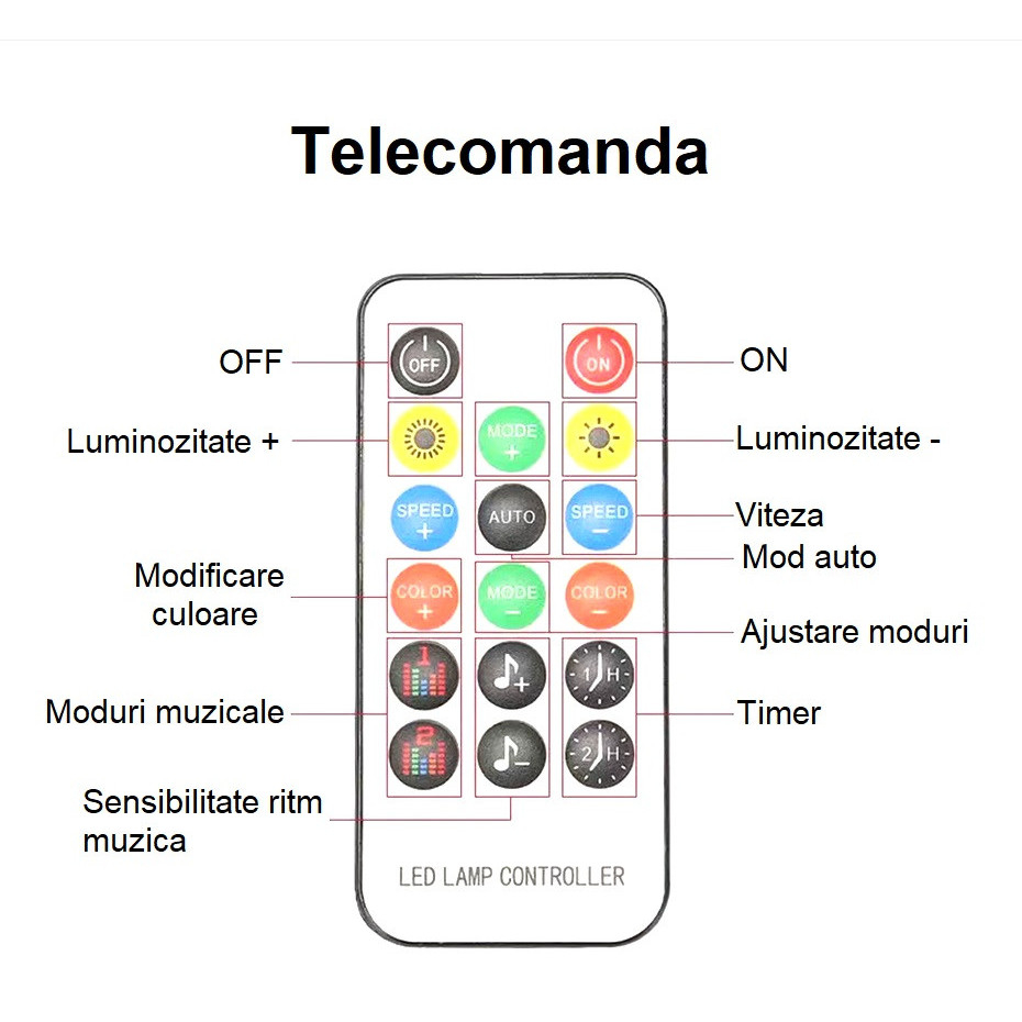 1 × telecomandă pentru schimbarea culorilor și efectelor