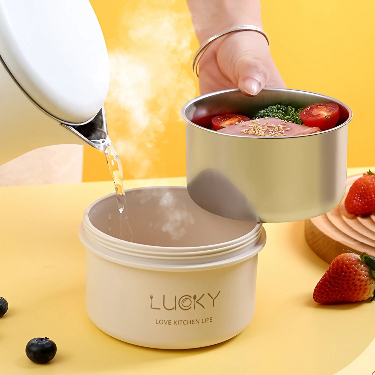 Spațiu intermediar cu aer – între stratul de inox și cel de polipropilenă se poate introduce apă fierbinte (max. 80–85°C) pentru a menține mâncarea caldă mai mult timp.